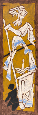 “Against stunned black the curling, quivering white folds float in slow motion. Like the Madonna—glowing marble melting over the knees of the ‘Pieta’...In the folds of her sari breathes a revived soul.” — M F HUSAIN M F Husain was deeply affected by Mother Teresa, whom he met for the first time at Palam Airport in New Delhi in 1979. His enduring engagement with her image was intertwined with a personal longing for maternal affection, shaped by the loss of his own mother when he was just two years old. As he once remarked, “I have tried to capture in my paintings what her presence meant to the destitute and the dying, the light and hope she brought by mere inquiry, by putting her hand over a child abandoned in a street. I did not cry at this encounter. I returned with so much strength and sadness that it continues to ferment within... To translate that pain in my paintings, I think I will have to die of it.” (Artist quoted in Ila Pal, “The Mighty McBull”, Husain: Portrait of an Artist , Noida: HarperCollins Publishers India, 2017, p. 99) Although Husain initially produced a handful of naturalistic portraits of the saint in the early 1980s, he soon shifted toward a more allegorical mode of representation, as seen in the present lot. Here, he moves beyond likeness to evoke not only Mother Teresa’s spirit but also the boundless compassion associated with the archetype of the Universal or Divine Mother. Remembering another occasion when he witnessed her tending to the sick and destitute, he confided to his friend Rashda Siddiqui that the experience permeated his entire being. He resolved that very day to paint her, yet recognised that realism alone could not encompass the magnitude of her presence or her life’s work. (K Bikram Singh, “Two Women and a Cyclone”, Maqbool Fida Husain , New Delhi: Rahul & Art, 2008, p. 229) To bring his vision to life, Husain travelled to Milan to examine depictions of saints in pre? Renaissance art, particularly their treatment of drapery. He later used these learnings in his portrayals of Mother Teresa’s iconic white cotton sari with its broad blue border. In works such as the present lot, he rendered her without facial features, transforming her individual likeness into a universal emblem of the ideal of motherhood. A child playing at her feet and a dove soaring above further reinforce this imagery, evoking unconditional maternal love and protection, while also alluding to the peace and hope to which the saint dedicated her life.