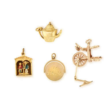 Set of four gold vintage charms, consisting of a spinning wheel charm, a weather house charm, a teapot charm, and a charm that spins and is engraved "MY DARLING". Each charm is crafted in 9K gold.