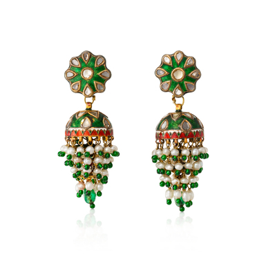 Each earring comprises a flower-head design set with diamond polki in a green enamel background suspending to a similarly designed jhumki set with green, red and white enamel and a fringe of seed pearls, mounted in gold.