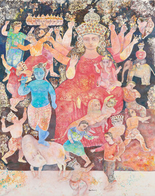 D espite coming of age as an artist in France in the 1960s, where geometrical styles and abstraction loomed large, Sakti Burman’s work has consistently been drawn to the figure. The artist has said of its appeal, “I made several attempts to give up figurative forms but the impulse to continue painting figures, to focus on humans, their feelings, their myths and legends, proved too strong.” (The artist quoted in Kishore Singh, “All Aboard the Ark of Sakti Burman’s Dreamworld”, Sakti Burman: The Wonder of It All, Mumbai: Pundole Art Gallery and Chennai: Apparao Galleries, 2012, p. 62) His works teem with disparate human, animal, and fantastical figures, an echo of the densely peopled household he grew up in. Burman draws on dream and memory, myth and reality. He is in the habit of constantly sketching people he encounters at cafes, airports, beaches, pools, and on his travels as a form of visual note?taking. Says Burman of this practice, “At the airport I make sketches of the fliers who arrive hours before the flights or of the tired transit passengers taking a rest or fast asleep on the couches or leisurely gossipping with fellow travellers or idly reading books or newspapers. These sketches are like notes I make while I am travelling or sitting in a cafe.” (The artist quoted in Singh, p. 51) These characters, once recorded, tend to show up in his works as faces, forms or simply in outline alongside gods, goddesses and creatures of myth like in the present lot. This work, a 2015 oil on canvas, exemplifies his style which merges several realms in dreamlike exuberance with his signature marbling technique reminiscent of Italian frescoes by masters like Giotto, Piero della Francesca, and Simone Martini. Around the edges of the work are many commonplace figures engaged in acts of revelry with their arms lifted high. Burman imbues each of these figures with a sense of movement as if they are dancing to a lively beat. It could likely be a nod to the celebratory atmosphere of his home growing up, where festivals were highly anticipated with the house given a fresh coat of paint and women drawing alpanas on the floor. Dancing figures feature heavily in a key childhood memory. Burman was entranced by the groom’s procession arriving for his elder sister, where the groom and his elephant were preceded by spectacularly outfitted musicians and revellers. He still recounted the grand event years later, “Till now I think it was the most beautiful procession of musicians that I have ever seen. Now whenever I happen to be present at a session of spirituals of New Orleans, an instant trip down memory lane takes me back to the musicians of my village.” (The artist quoted in “Roots Into A Splendid Crown”, Manasij Majumder, Sakti Burman: Dreamer on the Ark, Mumbai: Pundole Art Gallery, 2001) Burman acknowledged the centrality of remembrance to his practice, “My childhood memories are always there, mixed up with the realities of the day. In creative art, the role of memory is a recognized fact.” (The artist quoted in Majumder, p. 49) Mythology is an important influence on Sakti Burman. This painting is named for the Hindu goddess Durga who dominates the frame, attired resplendently in red. Burman presents her in her magnificent many?armed form worshipped with great joy and fervour throughout his native Bengal during the Durga Puja festival. One of her arms holds the god Ganesha who is seated in her lap. By pairing the two deities together Burman alludes to his own experience of Durga Puja as a child where he would see people dressed as Lord Ganesha celebrating with the revellers. Next to them stands the god Krishna in radiant blue with his flute poised as if he is about to play, adding to the celebratory atmosphere. At the back stands the ten?headed Ravana, the antagonist of the Hindu epic Ramayana whose images in illustrated children’s books Burman was drawn to as a young boy. Burman excels at bringing the real and fantastical together on a timeless plane to create works full of surreal wonder. The critic Kishore Singh remarks on his remarkable ability to distill his various influences into works of singular vitality, “And because he believes that ‘an artist must surprise himself each time’, he would take remembered images and put them in different time frames, disorient the viewer with the unexpected, juxtaposing gods and neighbourhood children, iconic figures and family members, such that it would become impossible to remove the real from the imagined. It was like theatre and the props followed—magical gardens with statues in them, circuses, mirrors, comedians and magicians, figures from India and European legends, the Sacre?Couer and the Taj Mahal…” (Singh, p. 57)