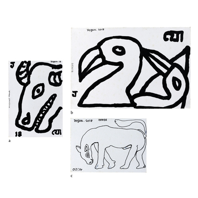 b) Birds Signed and dated 'Jogen 2018' (upper left), inscribed 'BIRDS' (centre left), initialled 'J' (lower left) and further initialled in Bengali (upper right) 2018 Ink on paper pasted on mount board 7.5 x 11 in (19 x 28 cm) c) Horse Signed and dated 'Jogen. 2018' (upper left), inscribed 'HORSE' (upper centre), initialled and dated in Bengali (lower left) 2018 Marker on paper pasted on mount board 5 x 7 in (12.5 x 18 cm)