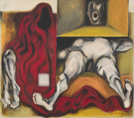 The present lot is one of A Ramachandran’s earliest works on canvas and was exhibited at his first one-man show at Kumar Gallery in Delhi in 1966. The conceptual depth of his imagery and technical command that these paintings revealed earned him praise from eminent critics such as Charles Fabri, who had been closely associated with Amrita Sher-Gil, and established him as a significant new voice in Indian art. Unlike his later works, which are a vibrant celebration of nature and pastoral life, these paintings present a grim meditation on human suffering. Ramachandran left his home in Trivandrum, Kerala, after graduating in 1957 and moved to the cultural centre of Santiniketan in West Bengal to gain greater exposure to the arts and further his understanding of Indian modernism. Sketchbooks from this period reveal how he used his time here to develop his own personal style and explore potential themes that would later guide his practice. While Santiniketan broadened his artistic perspective, it was the human tragedy he witnessed on visits to Calcutta, beginning in 1961, that provided him with his incipient themes. The city was still reeling from the devastation of the 1943 Bengal Famine and continued to draw refugees of the Partition of India, many who lived in squalor on pavements and railway platforms as they struggled to rebuild their lives. Recalling its impact, Ramachandran later wrote, “The city with its narrow lanes, broken colonial buildings, stinking sewages, stark poverty and innumerable human beings hovering around like ants has become part of my experience.” (Artist quoted in R Siva Kumar, Ramachandran: A Retrospective - Volume I , New Delhi: Vadehra Art Gallery, 2003, p. 70) In his monograph on the artist, art historian R Siva Kumar remarks, “He sketched what he saw on the streets of Calcutta, meditated on these motifs etched into his mind, and discovered in them his first images of man. It provided him with a personal matrix for mapping subsequent experiences... However, he did not transcribe them literally, but transformed these vividly experienced facts into haunting images of man.” (Kumar, pp. 70, 78) The resultant paintings are dominated by grotesque, distorted cadaverous figures, squeezed and compressed together in a constricted pictorial space. Titled Kaleidoscope , the present lot is “a collage of three motifs-a severed head, a headless body, and a drape-each separate and with a space of its own but complementary.” (Kumar, p. 70) Though the extreme foreshortening of the headless figure elicits comparisons with Renaissance painter Mantegna’s portrayal of Christ lying dead on a marble slab in his work Lamentation Over the Dead Christ , as Kumar notes, “this hunk of a corpse is not mourned or kept alive by the warm memories of the faithful… He is a dead weight that belongs to the cold space of the morgue. His nudity, his exposed genitals, tells us how vulnerable he is.” Above it, the disembodied head recalls the anguished faces of Tyeb Mehta’s Falling Figures, caught mid-scream as they plunge to the ground. This influence may stem from the close relationship that Ramachandran shared with Mehta around the time he painted this work. “...Set into a perspective-box over the insensate body,” the head “represents an anguished cry-a primeval, prelinguistic creaturely expression of pain. The box amplifies the cry. While the body recedes from us the cry, by a reversal of perspective, reaches out from the depth of the picture.” Together these figures evoke “not only pain, emptiness and death but also the loss of human wholeness. They invoke man torn into parts, broken down into fragments.” (Kumar, pp. 88-89)“My first image of man I developed in the streets of Calcutta.” - A RAMACHANDRAN