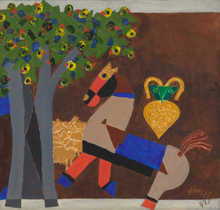 In 1937, M F Husain left his home in Indore for Bombay with no more than a few rupees to his name and a firm resolve to make his mark as an artist. He initially supported himself by painting cinema hoardings, and after his wedding in 1941, joined Fantasy-a family-run business in South Bombay that made nursery furniture-as head of design. Many of his illustrations, which were used as templates for designs for the studio’s furniture, initially drew from Western popular culture such as Disney films, nursery rhyme characters, and Hummel figurines. However, they seemed far-removed from Husain’s own upbringing in semi-urban India, and he soon introduced a new set of imagery inspired by Indian villages and folklore. This sense of rootedness to Indian myths and visual culture would remain a cornerstone of his art even as he rose to international prominence for his distinctive modernist language in the decades that followed. Husain resigned from Fantasy in 1949 to pursue art full-time, but its influence could still be seen in the wooden toys that he produced in the ensuing years. Mortimer Chatterjee explains, “In terms of material form, nowhere can the legacy of Fantasy be more clearly understood than in the artist’s production of wooden toys from the 1950s onwards. These objects, made with the help of skilled labour, deftly functioned at the intersection of art and design, providing access to those who wanted to possess a Husain, but could not afford his paintings (much in the spirit of his affordable prints). These wooden toys-in the form of carts, musicians, farmers, and bullocks-all quote directly from the wooden cutouts that Husain developed during his years at Fantasy.” (Mortimer Chatterjee, “World-Making: Husain at Play, in the Village”, Fantasy: M F Husain - Nursery Design and an Emerging Indian Aesthetic , Mumbai: Minal and Dinesh Vazirani, 2023, p. 141)“All forms of art are born from one’s roots.” - M F HUSAIN The horse in the present lot takes on a similar toy-like quality, affirming Ram Chatterjee’s view that in Husain’s hands these seemingly simple objects were transformed into lyrical works of fine art. (Ram Chatterjee, Husain’s Toys, Bombay: D B Rajpally, 1960, p. 3.) The animal, which became synonymous with the artist’s oeuvre, draws its form here from Indian folk-art traditions, which he believed could be adapted to suit a new international modernism. The inspiration for Husain’s horses came from various sources, including the classical and folk tradition of the Panchatantra and Jataka Tales, Indian sculpture, the horses of the Konark Sun Temple and the Bankura horse of West Bengal. But it was the image of the Duldul, the rigid white steed of the Prophet Muhammed’s son Imam Hussain carried out during Muharram processions, which remained his most powerful reference. An intuitive colourist, Husain often derived his palette from Basholi and Mewar miniature paintings, which he first encountered in 1948 when he and fellow Progressive Artists’ Group member F N Souza visited an exhibition of classical Indian art at Rashtrapati Bhavan in New Delhi. As critic Geeta Kapur writes, “Husain, more than any other artist, had the vital impulse to spread his sensibilities far and wide, across the vast stretches of the Indian countryside and bring in a kaleidoscopic imagery… He looked at Basohli miniatures which have (along with Malwa and Mewar miniatures) pronounced folk and primitive features. Husain loved the colour layout of these schools: the hot, bright colours, especially red and yellow (set off in the case of Malwa by blue-grey, chocolate-brown, and dull green), and their style of applying it flat over large areas which cuts short any naturalistic illusions contained in the themes as such.” (Geeta Kapur, “Maqbool Fida Husain: Folklore and Fiesta”, Contemporary Indian Artists, New Delhi: Vikas Publishing House Pvt Ltd, 1978, pp. 125, 139)