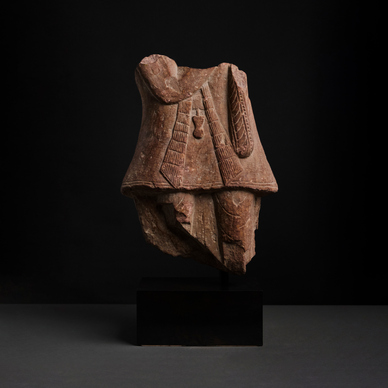 This imposing standing male figure is depicted in Central Asian courtly attire, wearing a long tunic with deeply incised vertical pleats, which reflects the cultural synthesis of the Kushan Empire, where artistic and sartorial traditions from the Indian subcontinent and Central Asia intersected. It is carved on both sides, with a secondary figure on the reverse, indicating that it was originally intended to be viewed in circumambulation. Such double-sided treatment is rare in Mathura sandstone sculptures, and its presence strongly suggests the work may represent a donor or noble patron. Its deep pink colour, characteristic of this region, enhances its visual appeal. The museum-quality work stands at the threshold between presence and absence as a fragment that is surprisingly modern in its abstraction. The loss of the head and limbs shift one’s focus from individual identity to form, allowing the jewellery, drapery, and sculptural mass to attain prominence.