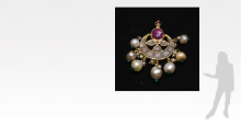 A maang tika is a forehead ornament worn where the hair is parted (maang), hanging down till the centre of the forehead. It is traditionally considered an essential part of a woman's ornamentation, and is one of the adornments that is, in some parts of the country, an auspicious symbol of marital felicity. Maang tikas are typically made of a precious metal and have a face set with gemstones, often with intricate enamelling on the reverse. They were prominently depicted in miniature paintings, and in the Mughal period, they were often made of pearls. Italian writer and traveller Niccolao Manucci, who wrote a memoir about the Indian subcontinent during the Mughal era, described them as, "Upon the middle of the head is a bunch of pearls... with a valuable ornament of costly stones formed into the shape of the sun, or moon, or some star, or at times imitating different flowers. This suits them exceedingly well." (Quoted in "Women's Jewelry in Aurangzeb's Court," Oppi Untracht, Traditional Jewelry of India, London: Thames and Hudson, 1997, p. 347)