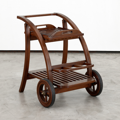 Teak with metal hardware and rubber wheels