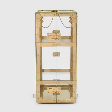 The cabinet features a dual locking system. The upper section is secured with two locks and gives access to the first shelf. The entire cabinet is accessible through two additional locks located on the side and can be opened along the vertical axis. It can expand to a maximum size of 40.25 x 43.25 x 12.25 in (102 x 110 x 31 cm)