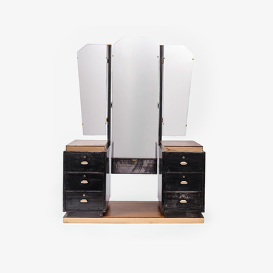 The vanity table has a trifold mirror and its accompanied with a set of keys. The piece is attributed to Allwyn Steel Furniture